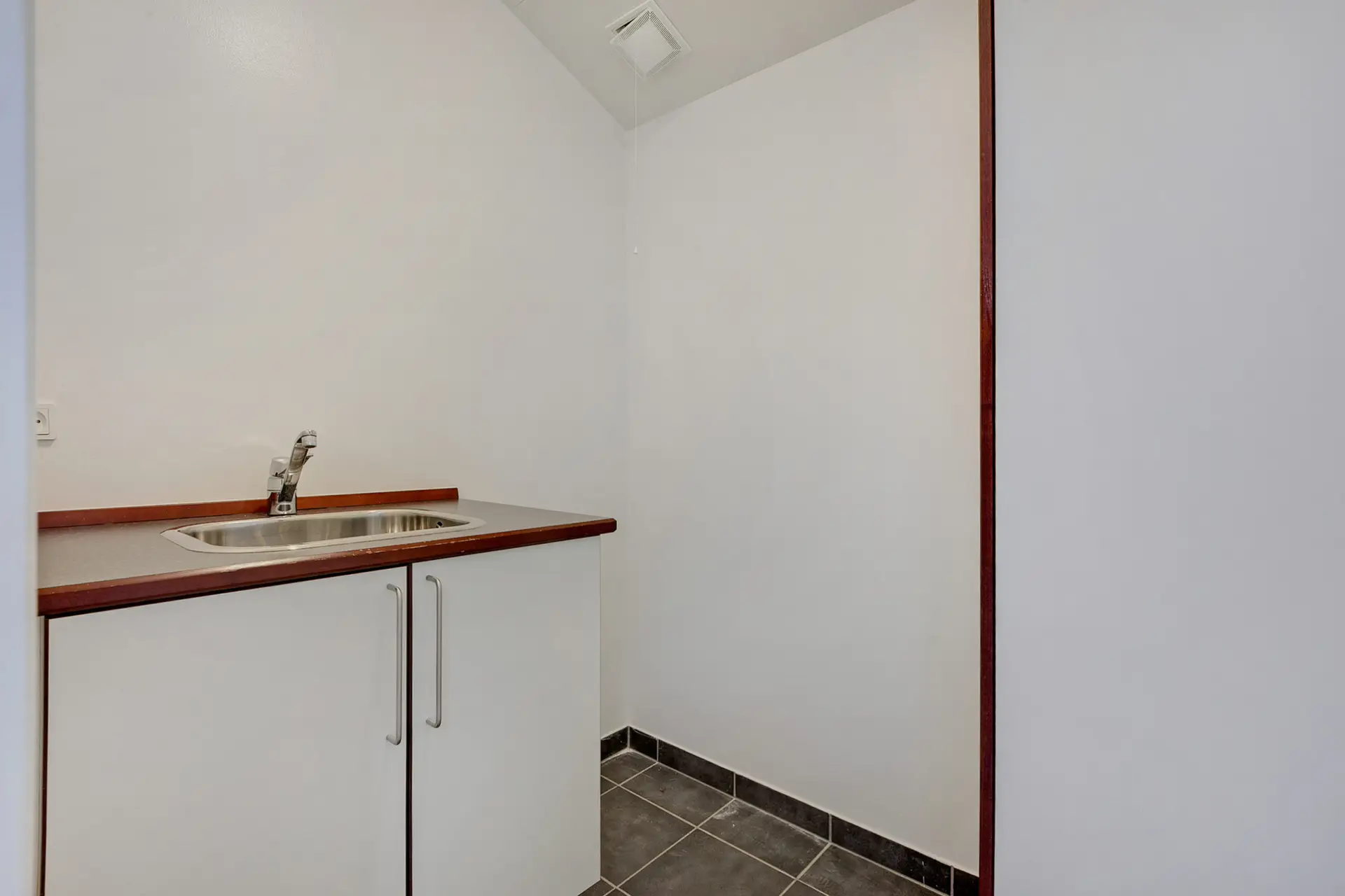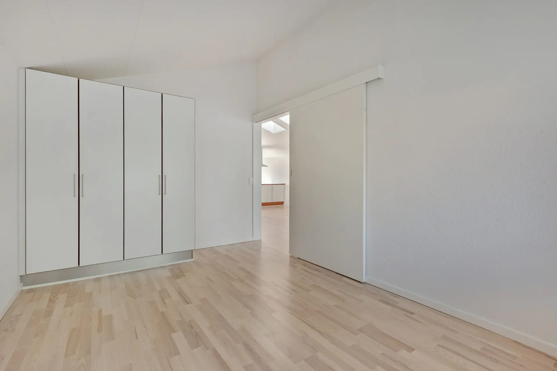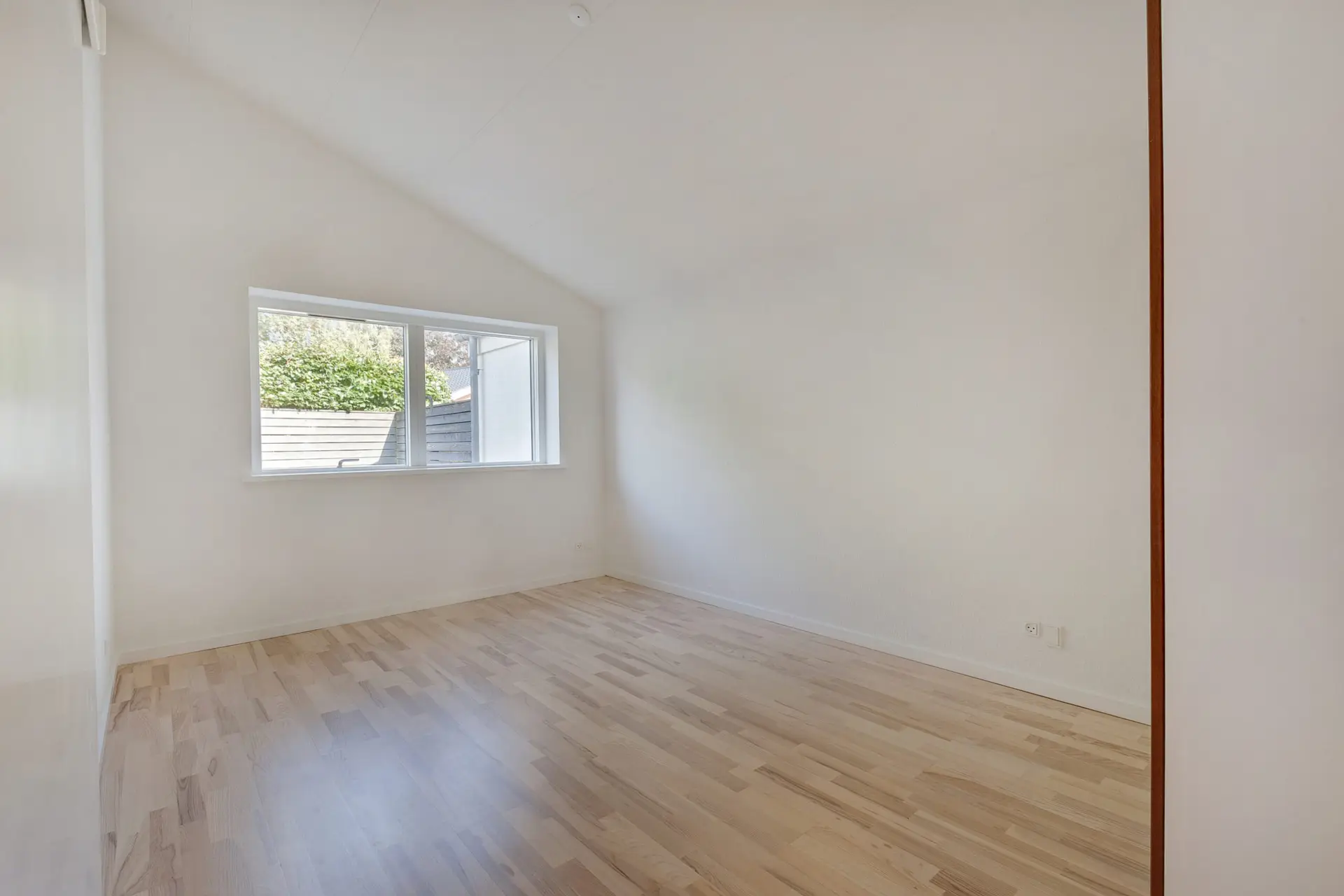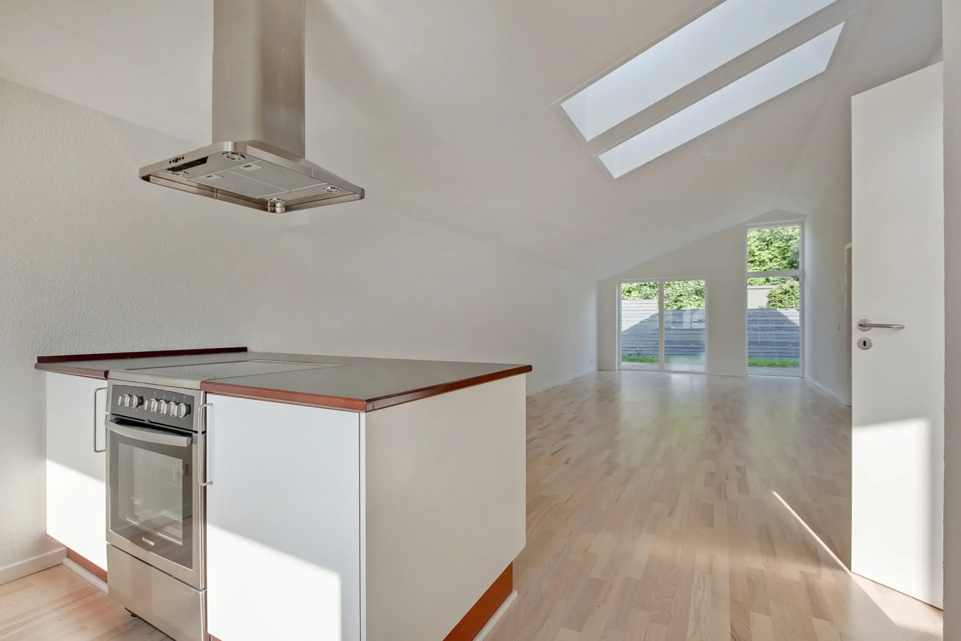 Store ovenlys vinduer med delvis fjernstyring, parket gulve og hårde hvidevarer i stål.